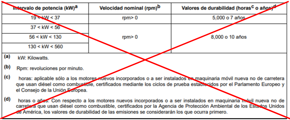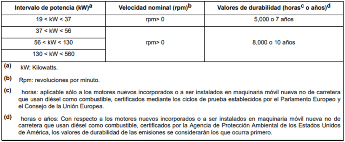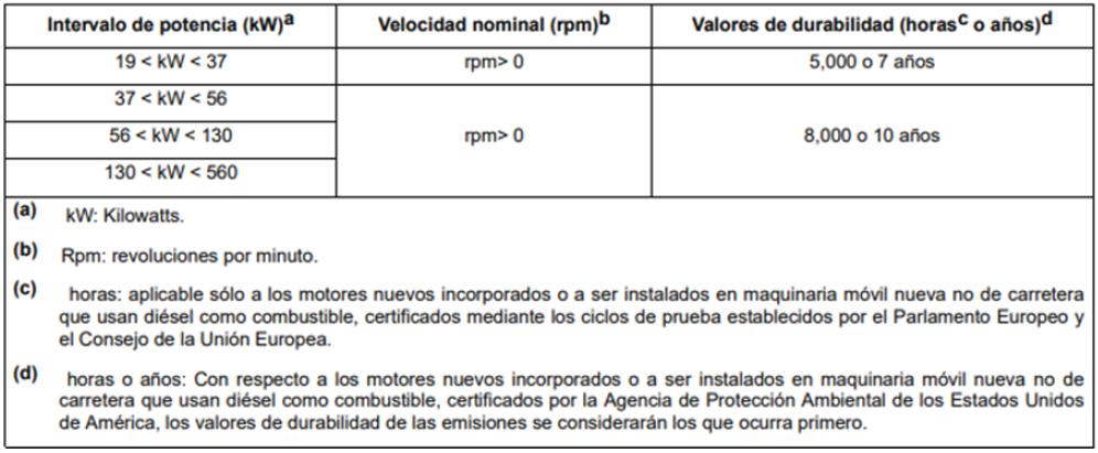 Dice: Tabla 2- Valores de durabilidad de las emisiones de los motores nuevos incorporados o a ser instalados en maquinaria móvil nueva no de carretera que usan diésel como combustible, certificados de origen por la Agencia de Protección Ambiental de los Estados Unidos de América o por el Parlamento Europeo y el Consejo de la Unión Europea o la Comisión Económica de las Naciones Unidas para Europa.