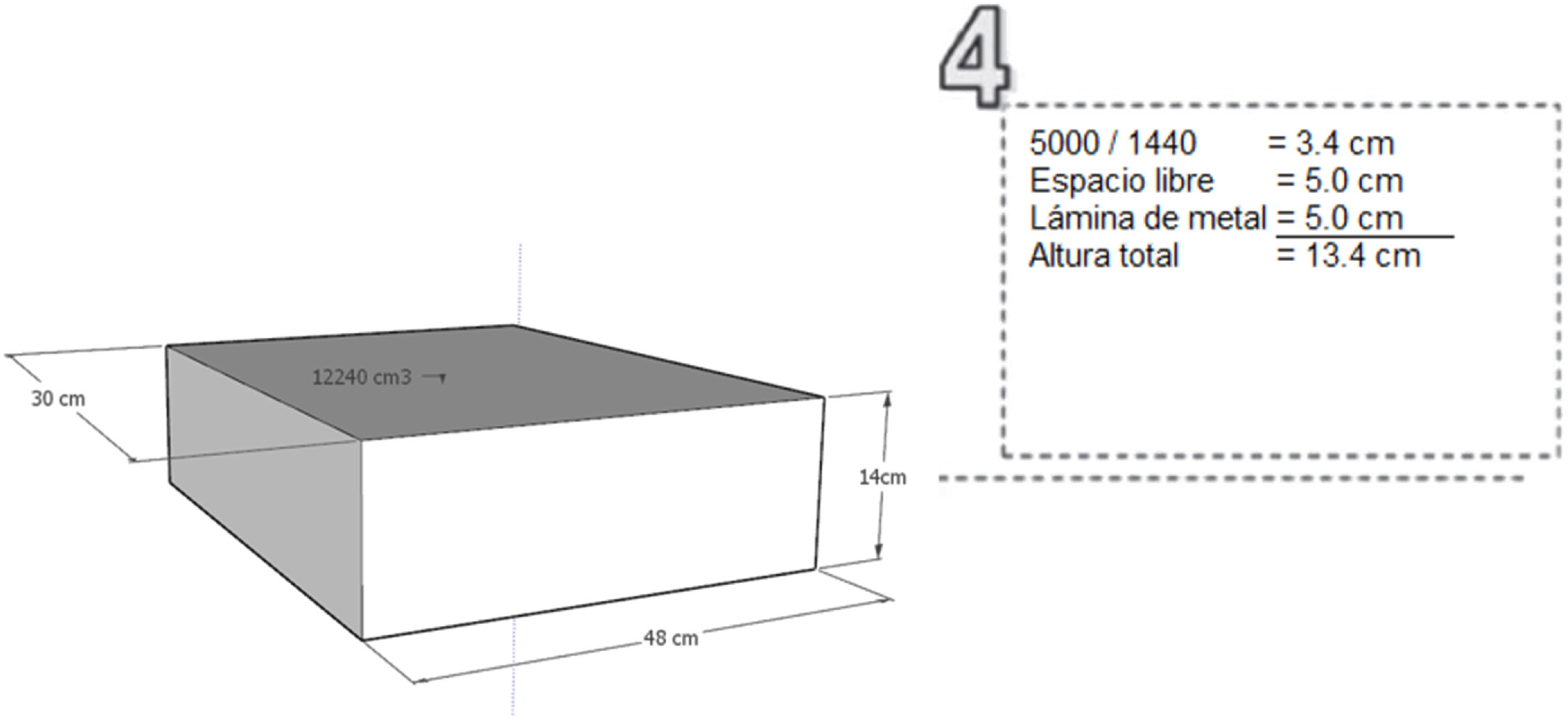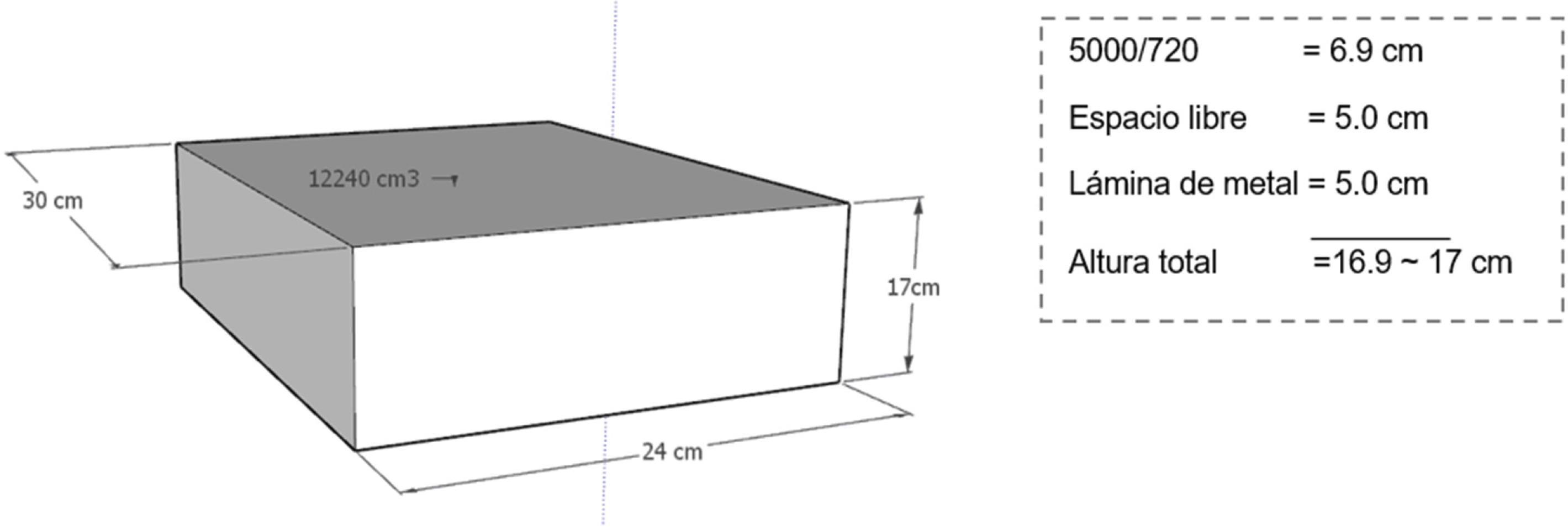 c) Calcule la altura de la olla necesaria para contener 5L de agua (ver Tabla E.1 de equivalencias). Agregue 5 cm a la altura calculada para el bastidor de metal que vinculará a las paredes.
