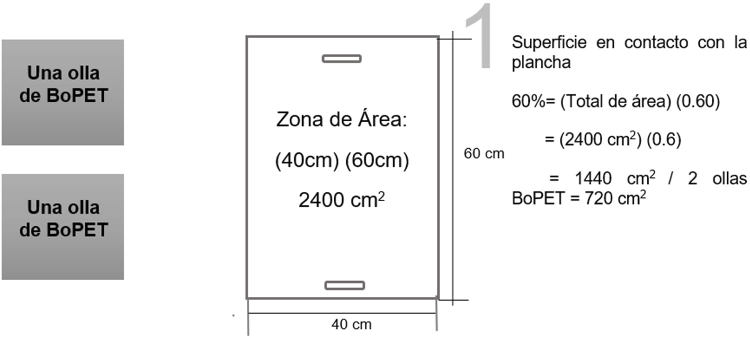 Figura E.6 - Ejemplo de las dimensiones de la superficie de la olla de BoPET para cada una de las dos ollas en contacto con la plancha de 40 cm por 60 cm