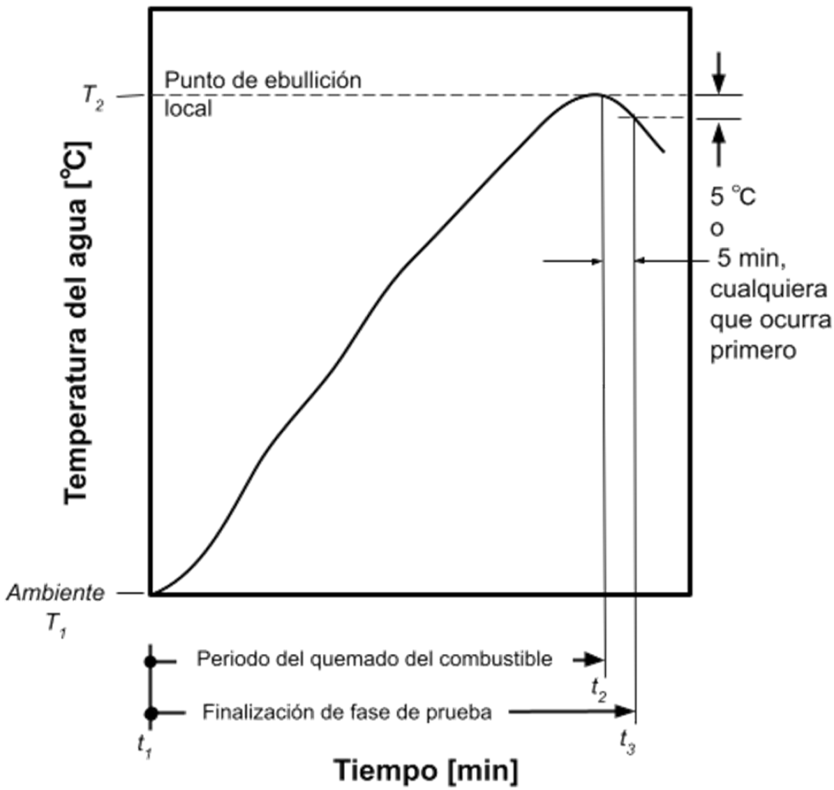 Figura 4 - Gráfico ilustrativo de la temperatura del agua contra el tiempo para cualquier fase de prueba cuando la temperatura del agua alcanza el punto de ebullición local al final del período de combustión del biocombustible